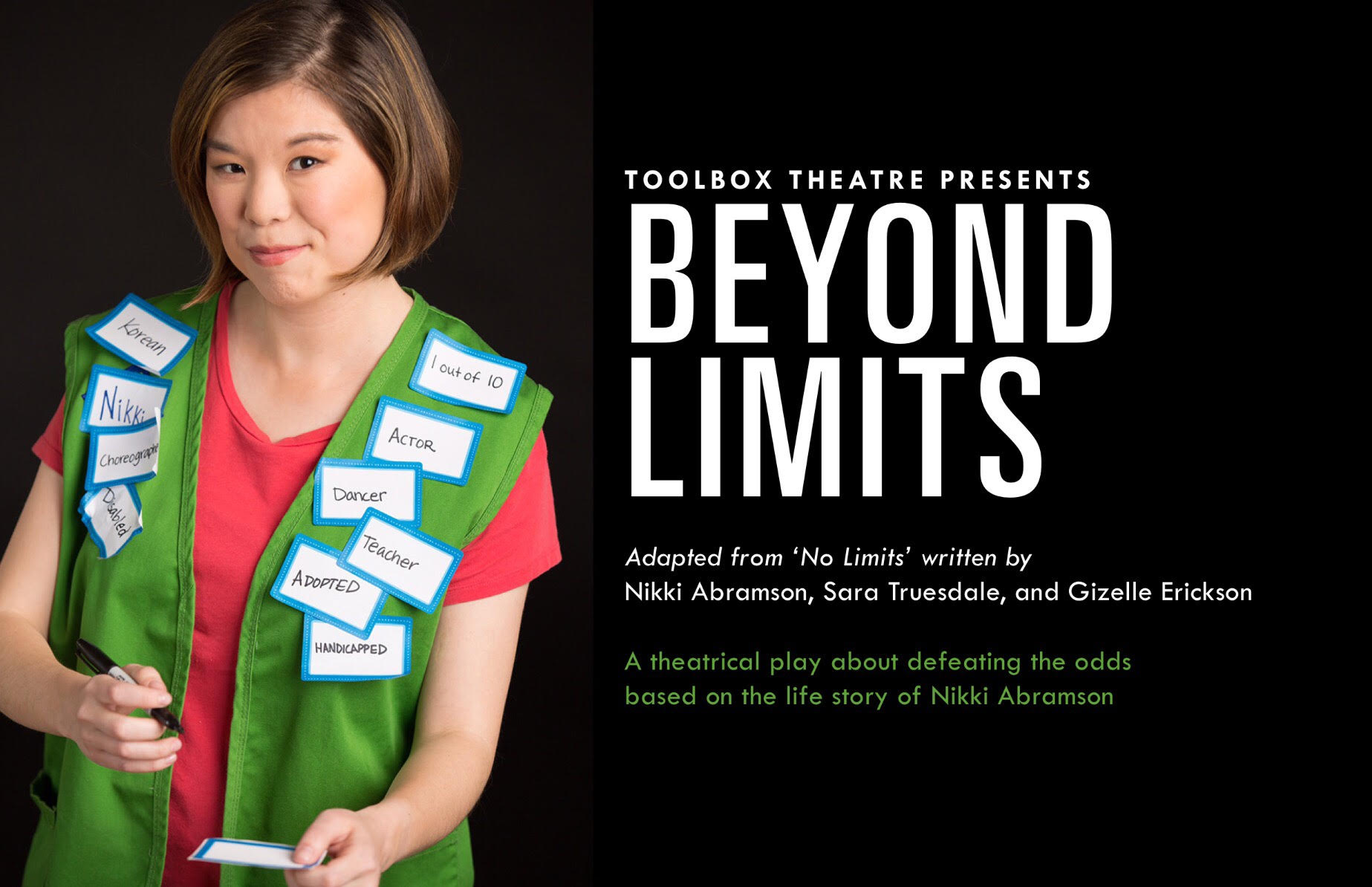 “Beyond Limits” is performed by Breaking Barriers with Toolbox Theatre LLC (BBTT). BBTT is co-run by three individuals who helped start this journey: Nikki Abramson (Creative Director, Co-Playwright), Sara Truesdale (Artistic Director, Co-Playwright), and Dennis Dienst (Managing Director, Set Designer).